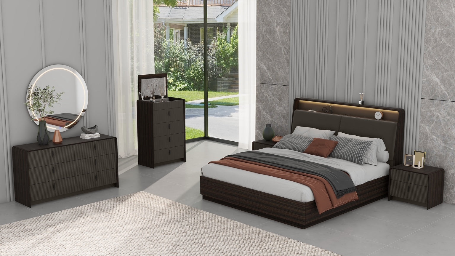 4 Piece Dresser/Mirror package consists of: 1 x Bedframe, 2 x Bedsides, 1 x Dresser/Mirror